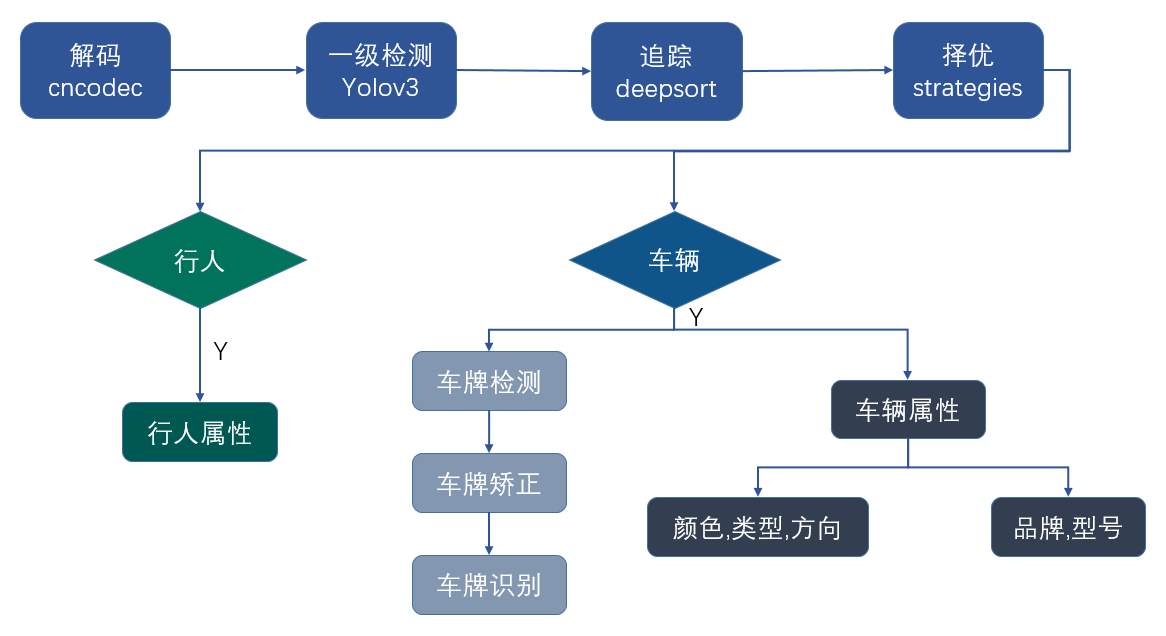 整个流程包括以下环节:解码、检测、追踪、选优、行人或车辆属性分析、输出等。