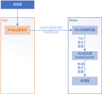 MLU前处理指的是解码后输出在MLU内存的YUV数据不再拷回主机端,而利用MLU Resize/Convert算子在MLU上直接把解码后的YUV数据转换成后续推理插件离线模型所需的格式和尺寸。