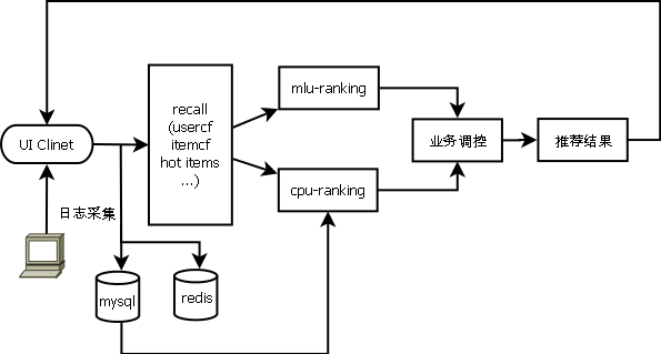 前端UI负责接收并发送用户请求,接收并展示推荐结果